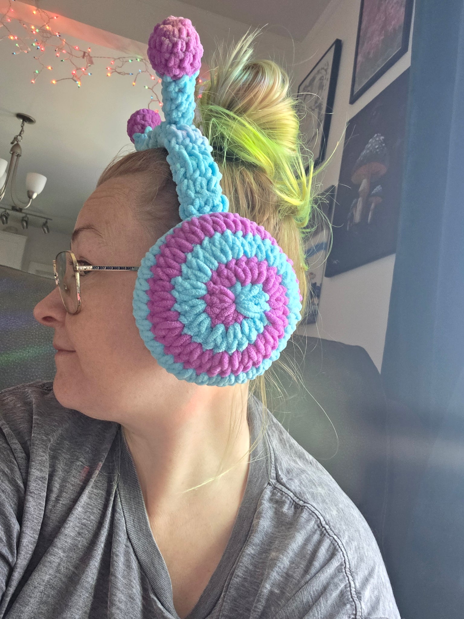 Handmade crochet e-luffs in a bold electric blue and purple colorway with trippy snail details. Loud, playful, and impossible to miss. Designed for festivals, raves, cold nights, or everyday wear when you’re not interested in looking normal. They’re UV reactive, so they glow under blacklight, and they’re seriously warm thanks to a thick, plush interior.